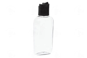 Quantity: 1 clear oval plastic bottle with black disc-top cap.