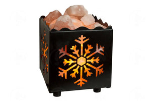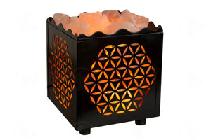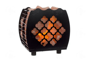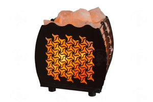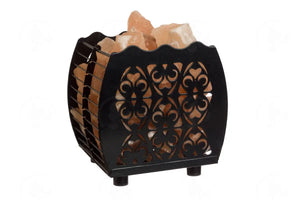 The ornamental metal basket contains salt crystals surrounding a lamp that generates heat..