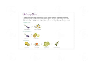 Sixteen coloring pages each with a different essential oil reference and common uses guide. Includes three relaxing blends recipes.