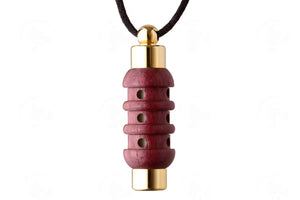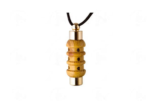 Diffuse your favorite aroma all day with this beautiful wood pendant in a honeycomb shape. Each piece is hand-crafted from an exotic wood by a skilled artisan. Accenting the pendant is 24K gold-plated trim and a black fabric cord. The pendant holds a wick that can absorb numerous drops of essential oil; small openings in the wood allow continual diffusion. The unique look of each piece varies slightly with the cut of wood.