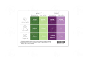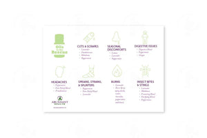An essential reference for your personal first aid kit, this usage card explains which essential oils to use for life's little emergencies. The front side lists oils for burns, cuts and scrapes, insect bites and stings, sprains and splinters, among other things. The back outlines application methods and dilutions for both adults and children. Store this card inside your personal first aid kit to always be prepared.