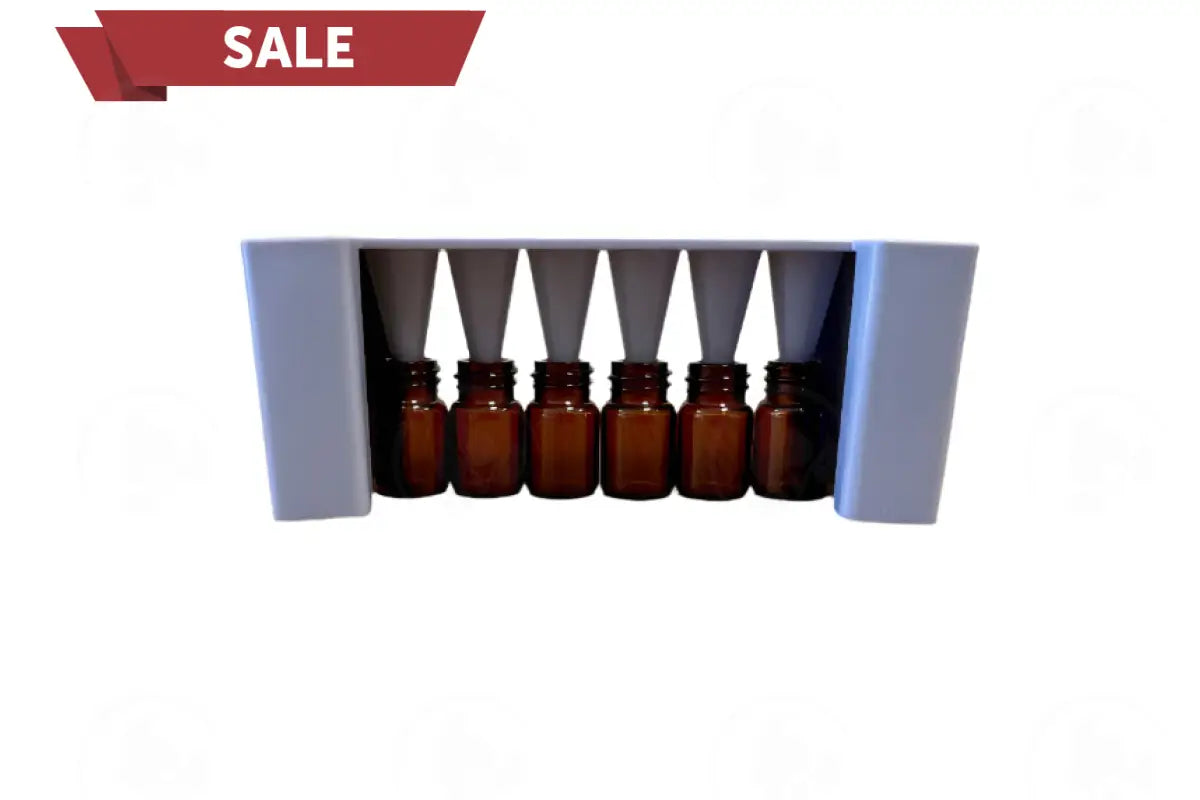 This two-part funnel system is constructed from FDA-approved food-safe plastic, ensuring safety and reliability. Designed to accommodate six size 00 capsules simultaneously, the funnel system effectively directs oils into the capsules without any spills.